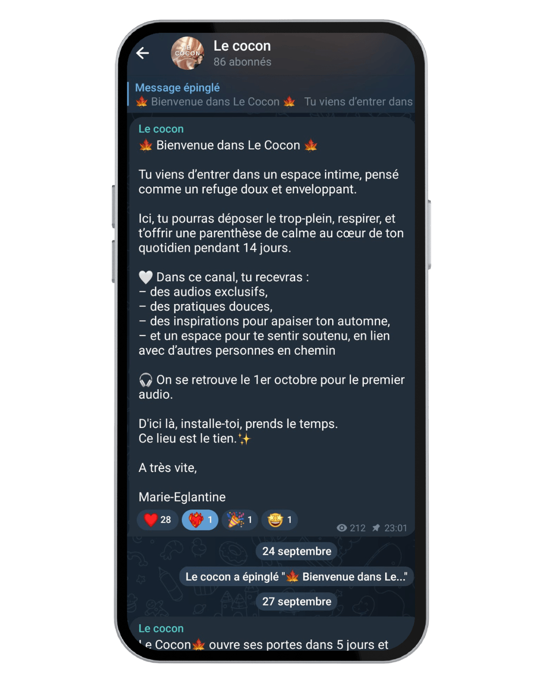 Le Cocon est une immersion de 14 jours qui se déroule dans un canal privé sur Telegram. Tu reçois immédiatement après ton paiement l'accès au canal Telegram qui contient :